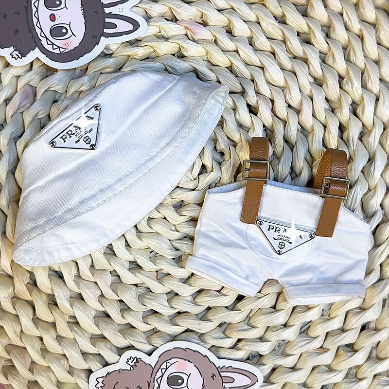 Labubu in off-white dungarees with brown leather straps and matching bucket hat – the perfect urban casual style for modern collectors.